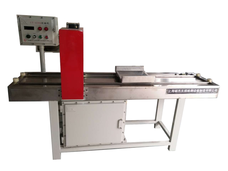 CT-450E型退磁机由退磁线圈、输送小车、传输轨道、机械床身以及防爆电器柜、防爆控制装置等组成,是消除工件经磁粉检测后内部剩磁的一种专用设备,同时,也可对工件进行充磁磁化。工件充、退磁均采用交流电,退磁电流大小连续可调,并数字显示;工件退磁采用远离法退磁,退磁后剩磁小于3GS。退磁时,首先调节好所需要的退磁电流,然后将工件置于退磁小车之上,通过移动小车在轨道上运行,带动工件穿过并远离退磁线圈,达到退磁的目的。